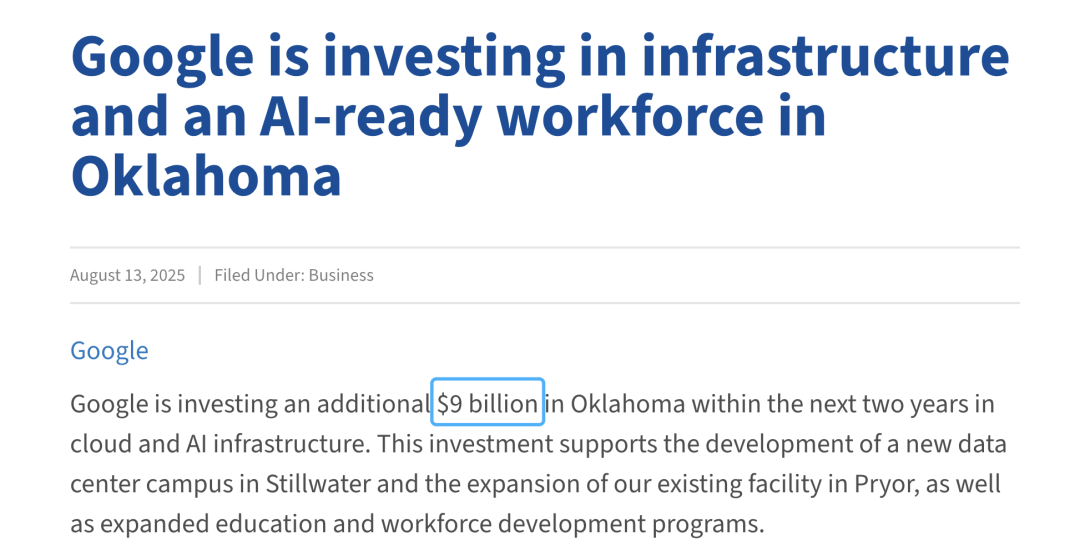 谷歌许诺将来两年投资90亿美元用于扩建美国AI云取数据核心图片来历于Oklahoma Commerce官网截图